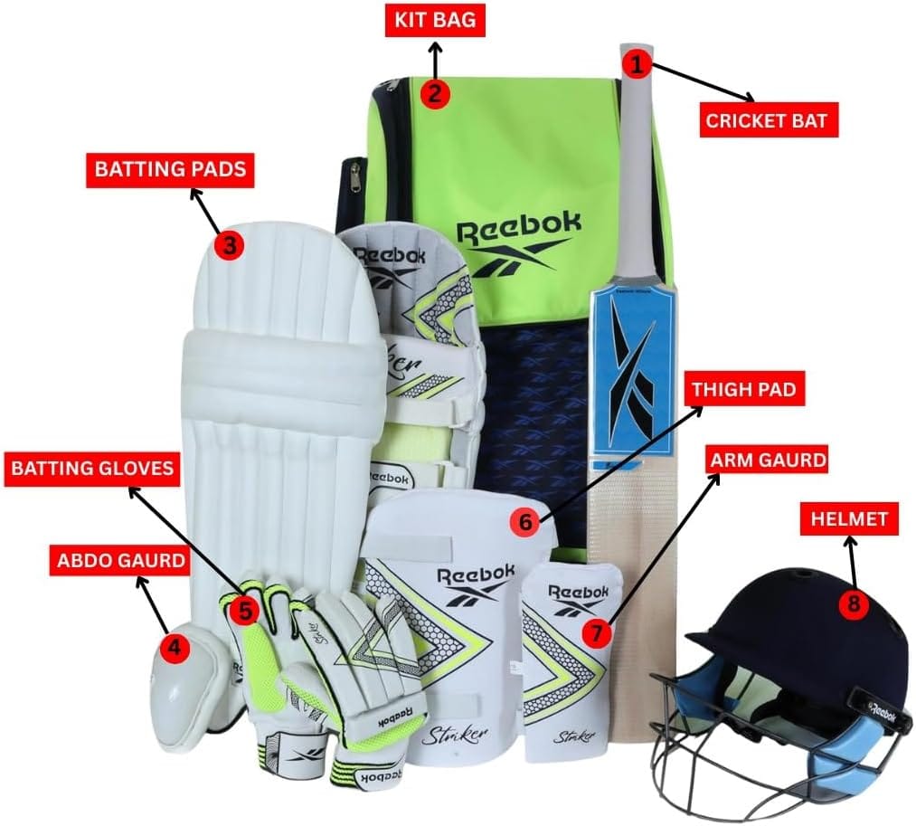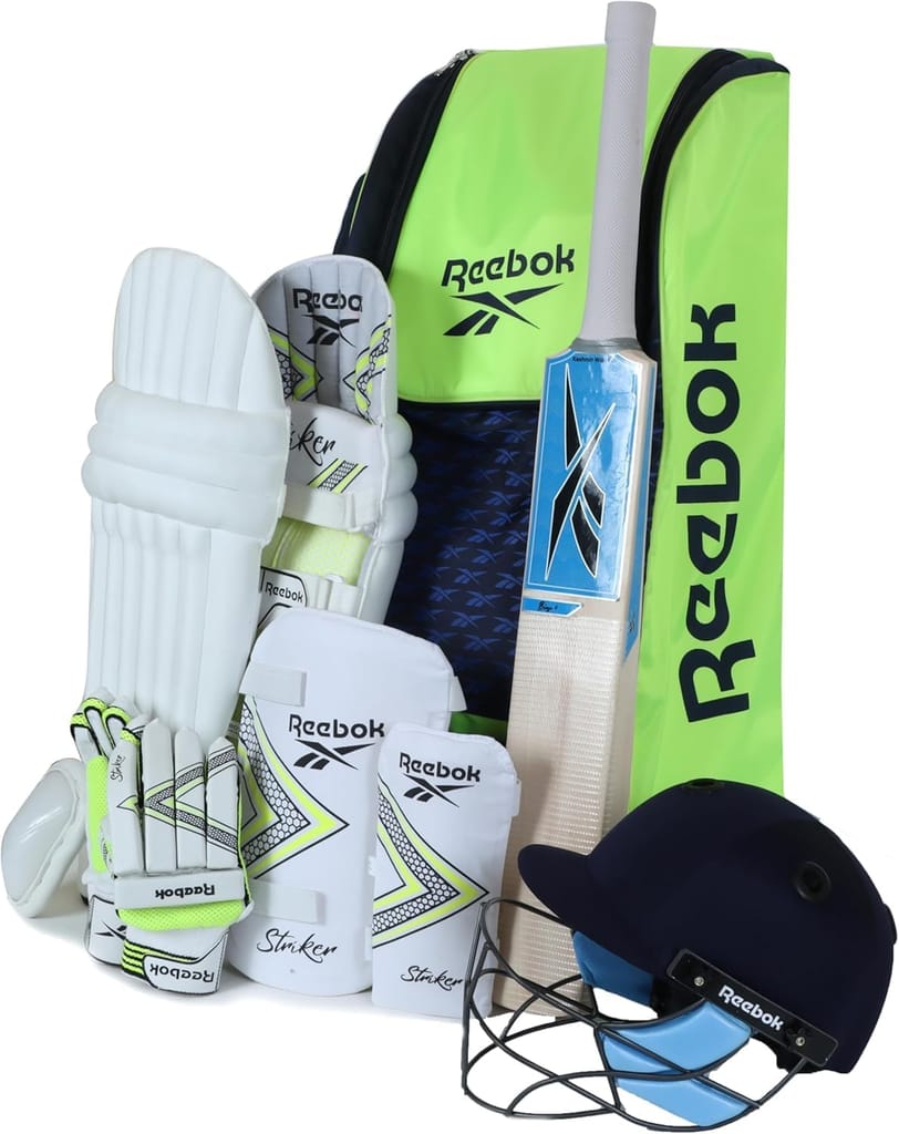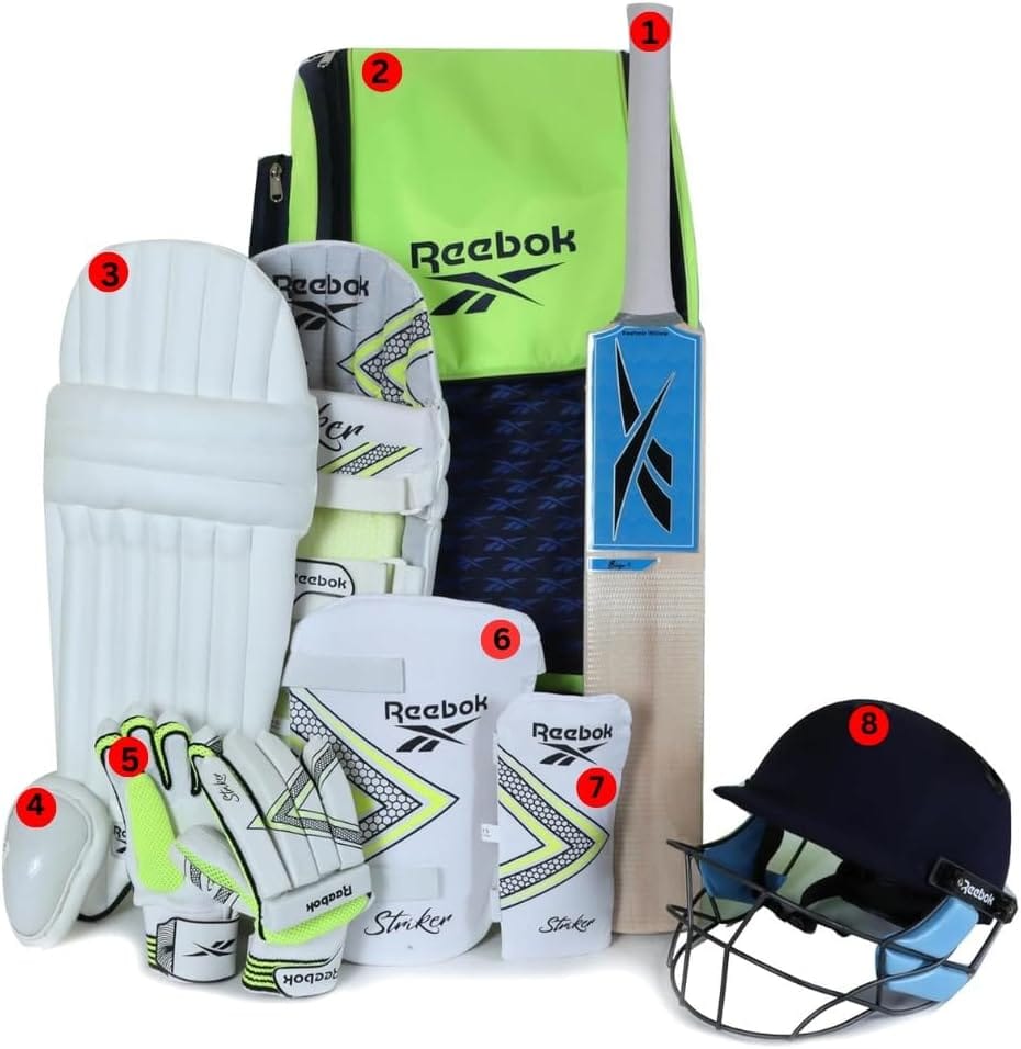 हे रिबॉक क्रिकेट किट प्रशिक्षण आणि सामन्यांसाठी डिझाइन केलेला एक संपूर्ण, फॅक्टरी-पॅक केलेला ८-पीस सेट आहे. प्रत्येक किटमध्ये एक क्रिकेट बॅट, बॅटिंग पॅड्स, बॅटिंग ग्लोव्हज, प्रोटेक्टिव्ह गार्ड्स, हेल्मेट आणि किट बॅग यांचा समावेश आहे.